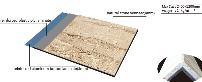 4mm marble laminated with 3mm aluminium poly backing, totally 8mm thick Largest size: 1524x2438mm